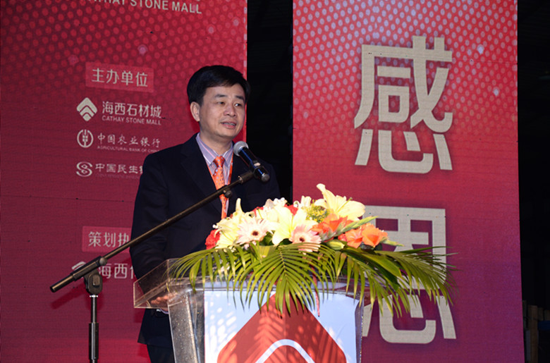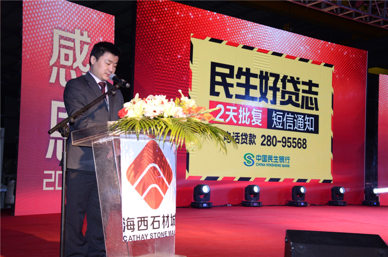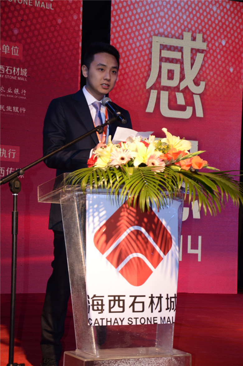 隨后,主要分管招商工作的海西股份副總經理葉喬鈞代表公司上臺致辭,對海西所有同事,及石材界、金融界朋友的光臨表示感謝。作為剛剛學成歸來、接觸石材行業不久的“新人”,他在臺上做了自我介紹,并虛心表示希望大家多向他提出建議,多多互相交流進步,攜手共同繁榮海西。同時,他表示海西的“大”不單指規模之大,更主要的是服務范圍之大,海西正在不斷地完善所有軟硬件配套設施,爭取為所有商戶提供最好的金融服務,日后海西團隊將把宣傳海西作為工作的重中之重,把海西的知名度推廣出去,增加海西的人流量,大家一起努力,明天會更好。