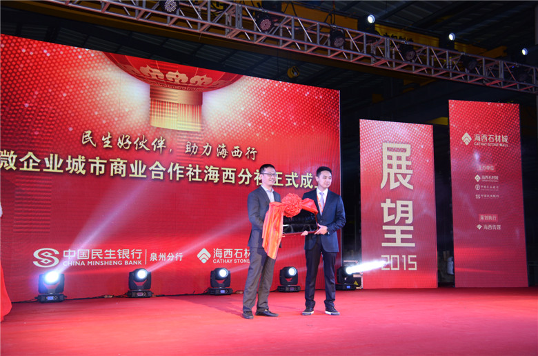 可喜的成績與鄭重的承諾,得到了所有員工、商戶與友人的信任與支持。晚會現場還宣布了小微企業城市商業合作社海西分社的正式成立,民生銀行泉州分行副行長葉澤鋒為合作社授牌,并同民生銀行石材產業金融事業部總裁助理陳輝遠分別為會長、副會長、秘書長頒發聘書。同時,晚會還舉行了海西石材城2014年優秀團隊和優秀員工頒獎儀式。