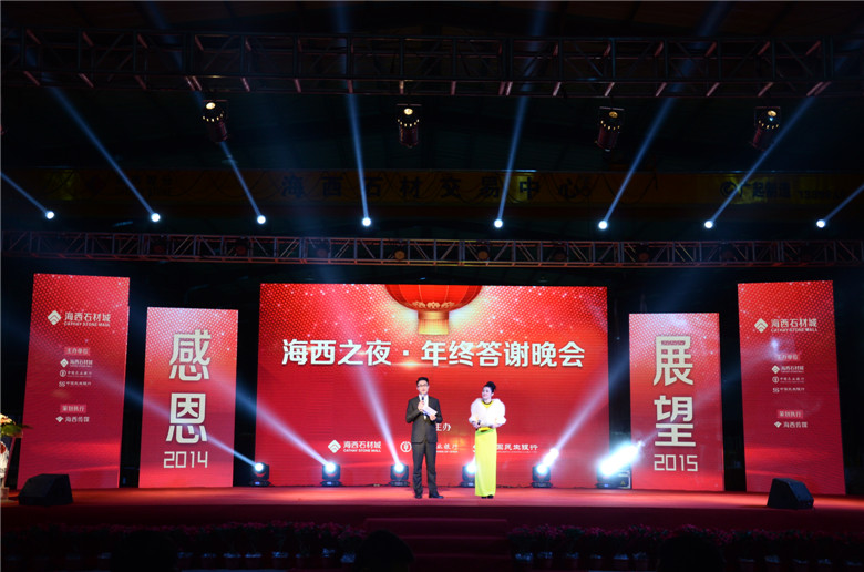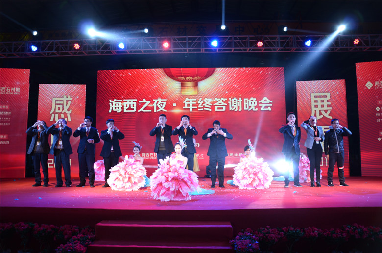 “海西之夜年終答謝”晚會隆重舉行,上千人共享盛宴!作者:李雅芳 李世欽 來源:《海西石材》雜志 時間:2015-1-31 12:57:52 1月30日晚,由海西石材城主辦的“海西之夜·年終答謝”晚會在海西石材城大理石精品市場一期內隆重舉行。海西股份總經理、福建三葉集團董事局主席葉維新、海西高管團隊周勇、陳添安、陳少健、葉喬鈞等攜領海西所有員工,及近千位海西商戶、各界友人齊聚一堂,共享視聽盛宴。 晚會伊始,海西股份總經理、福建三葉集團董事局主席葉維新上臺致辭,回顧總結了“海西”在2014年所取得的成就,為所有支持海西的商戶及各界友人送上由衷的感謝與祝福,同時承諾海西一定會為大家創造最好的平臺,帶來更多的財富。